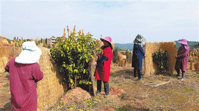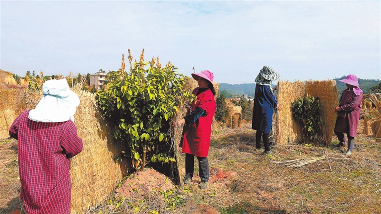 日前,在南丰县太和镇下桐村橘园,橘农正在做好橘树防寒抗冻措施。寒潮天气来袭,南丰县及时发布预警信息,组织农户加强农作物防寒管护。 通讯员 邓 鹏摄
