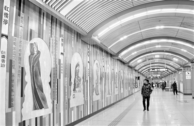 ① 乘客在磁器口地铁站内观看“红楼梦”壁画(1月20日摄)。