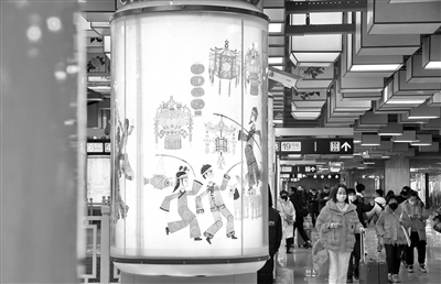 ③ 这是平安里地铁站内的中国传统皮影戏走马灯灯柱(1月20日摄)。