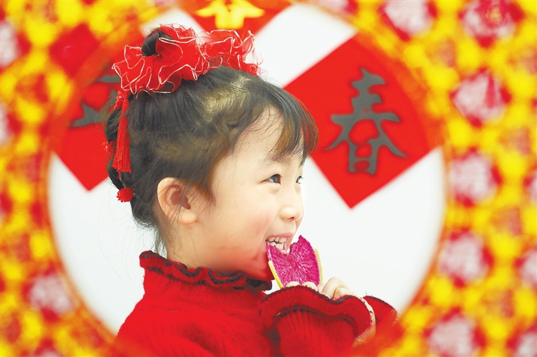 2月4日,在河北省唐山市丰润区太平路街道纺织二社区,小朋友在吃萝卜“咬春”。 新华社发(朱大勇摄)