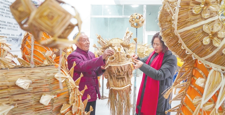 | 2月2日,湖口县流泗镇国家级非物质文化遗产项目草编(湖口草龙)代表性传承人喻芳泽和女儿在细心编扎草龙。农历龙年将至,前来定制草龙的客户络绎不绝,喻芳泽加班加点赶制不同规格、类型的草龙,为龙年春节增添热闹与喜庆。