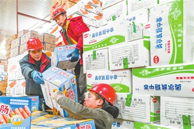 | 2月5日,南昌肉联食品集团有限公司冷库区域内,工人正在装卸冷冻货物,供应市场。通讯员 罗梦婷摄 |