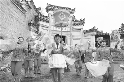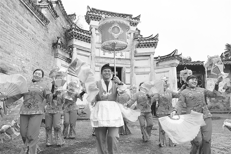 2月7日,在宁都县田埠乡东龙村,村民身穿彩服手持纸扇,表演茶篮灯舞,一派欢乐祥和气氛。每年春节期间,当地群众都以舞茶篮灯的方式迎新春、送祝福。