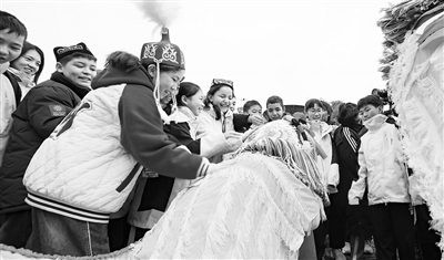 2月9日,定南县历市镇明远第围,来自新疆克州的小朋友在这里过大年,观看定南瑞狮和舞龙非遗民俗表演。2月8日至12日,“赣克两地一家亲,民族团结过大年”青少年足球冬令营活动走进定南县。