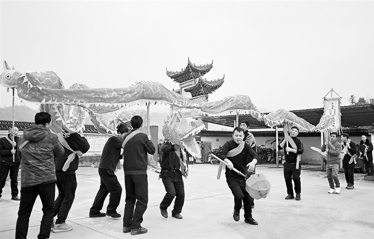 2月8日,金溪县何源镇彭家村非遗传承人在表演省级非遗“矮脚龙”,红红火火闹新春。