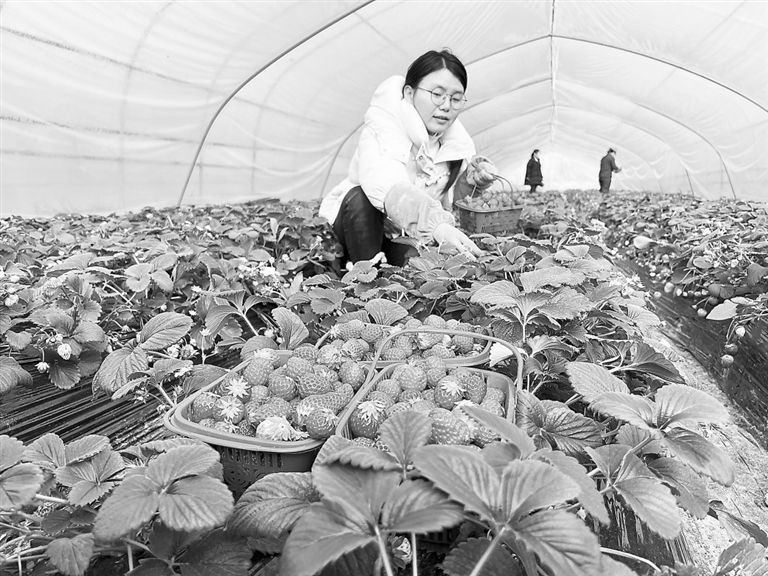 2月8日,在靖安县香田乡红岗村草莓大棚内,成熟的草莓吸引游客前来品尝,享受采摘乐趣。通讯员 陈章业摄