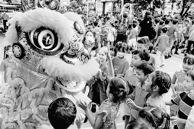 ▶2月7日,孩子们在印度尼西亚巴厘岛金巴兰观看舞狮表演。 新华社发(迪基摄)