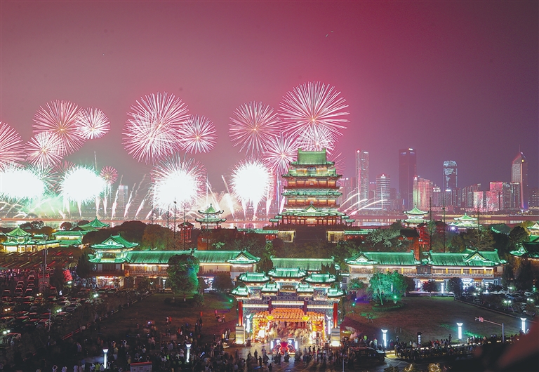本报南昌讯 (全媒体记者吴志刚)火树银花耀赣江,欢歌笑语满洪城。2月10日,农历正月初一晚,滕王阁畔,赣江上空,“龙腾盛世 花开满江——2024年南昌市迎春烟花晚会”盛情绽放,以8982发礼花弹、2400架无人机、亚洲最大音乐喷泉、一江两岸灯光秀相结合的方式,展现“物华天宝,人杰地灵,天下英雄城——南昌”的新时代风貌。