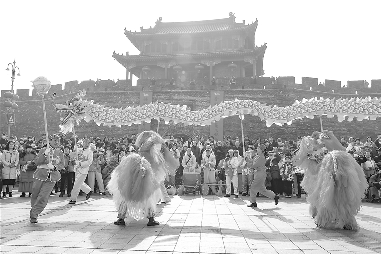 ◀民间艺人在湖北省襄阳市古城开展的“龙年民俗大拜年”民间文化展演活动中舞龙。 新华社发(杨 东摄)