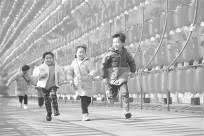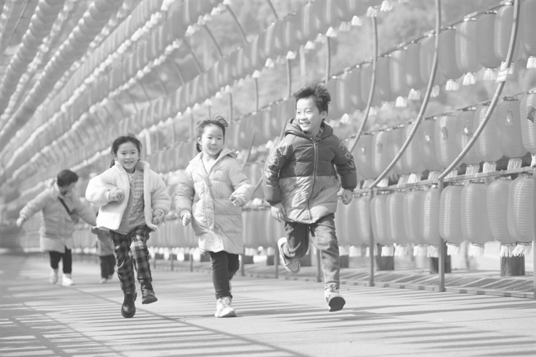 ▼孩子们在重庆市北碚区缙云山三花石游客中心灯笼长廊游玩。 新华社发(秦廷富摄)