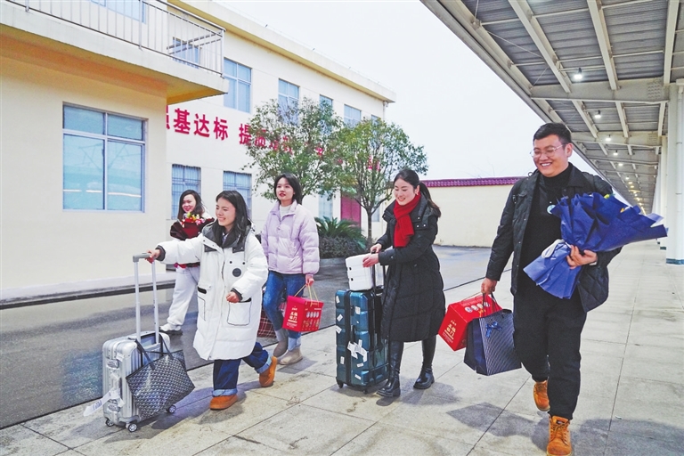 1月29日,G9881次列车上,司增辉和家人们带着冻梨等东北特色年货来到赣州于都“探亲”,黄淑珍、谢淑珍手捧鲜花热情地欢迎他们。