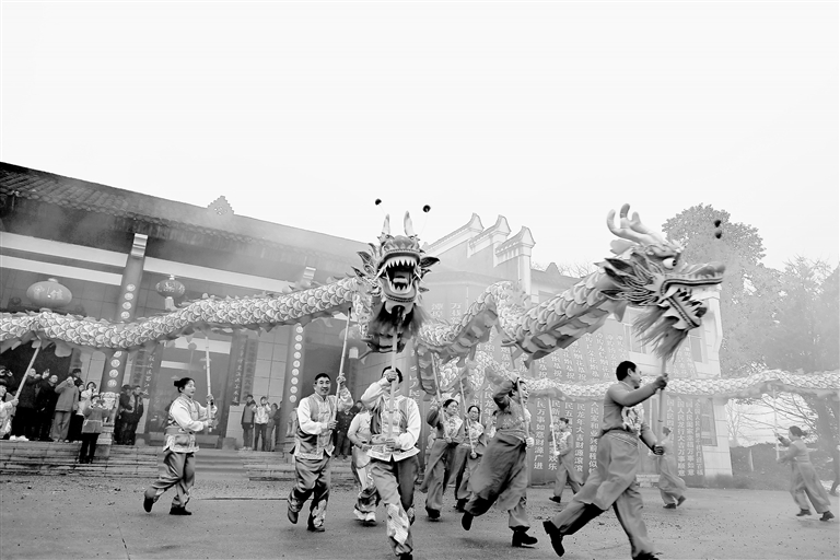 2月8日,万载县潭埠镇池溪村村民在文化礼堂前舞龙迎春。当日,该村举办主题为“大地欢歌迎新春 五谷丰登庆丰收”的乡村春晚,舞龙、得胜鼓、傩舞、小品、花灯戏等节目精彩上演,丰富了群众的文化生活。本报全媒体记者 邹海斌摄