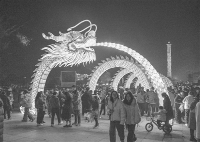 2月11日,婺源县紫阳公园文化广场,“龙腾盛世”巨型生肖龙灯亮相,吸引着许多市民和游客前来观赏。通讯员 王国红摄