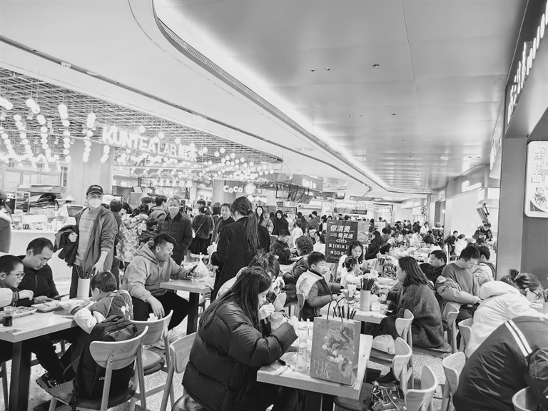 2月13日下午,在南昌市某大型商场美食一条街,市民和游客在品尝美食,感受浓浓的年味。