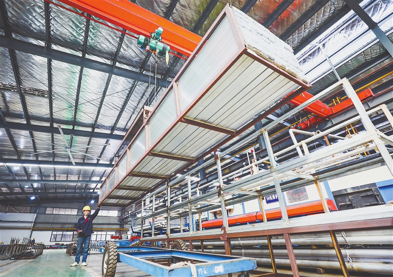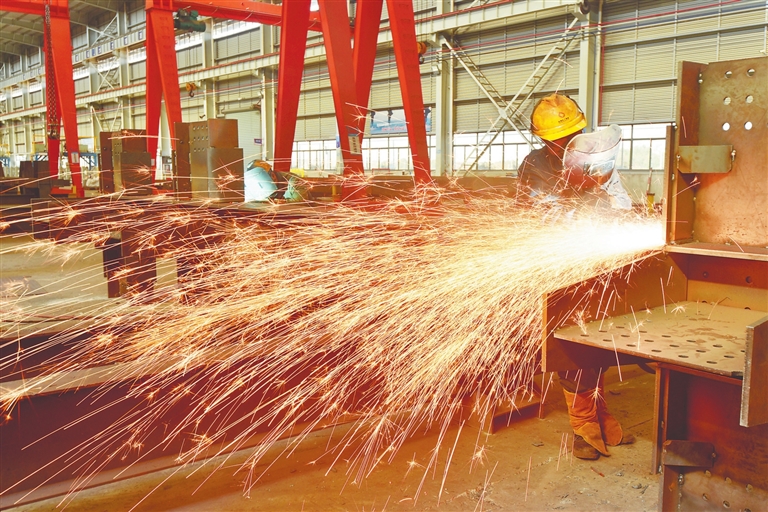 2月14日,在位于进贤经开区的致邦住工集团钢结构生产基地,工人正在生产一批出口的装配式钢结构厂房构件。为了赶制订单,该公司春节期间4条生产线正常开工,保证按时完成订单任务。 通讯员 樊哲平摄
