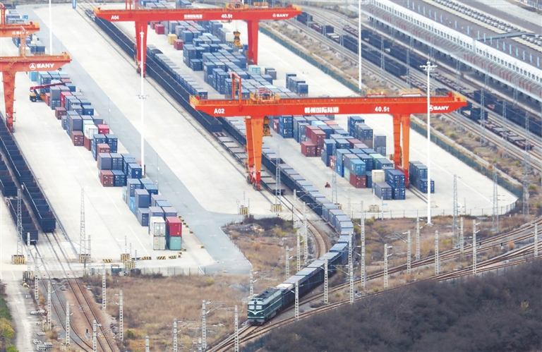 2月18日,一列满载货物的铁海联运班列从赣州市南康区赣州国际陆港发车,驶向深圳盐田港。通讯员 杨小明摄