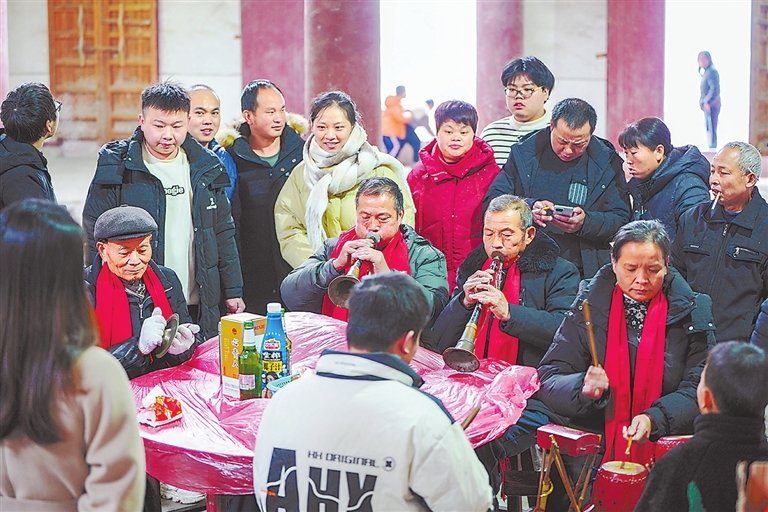 一曲节奏欢快的《四子调》吹完,胡贞化又吹起了《百合鸟》。他吹着高音,另一名唢呐手配合吹低音,高音嘹亮、刚劲,低音清澈、绵柔,似鸟儿在耳旁欢声歌唱。乐队里其他三人也分工明确,各自踩着节拍,打起小锣、小钗和三星鼓。这来自乡间的传统音乐,混合着浓浓的年味,余韵悠长。