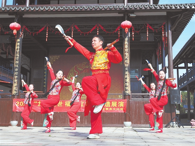 “哒哒哒、哒哒哒……嘿嘿嘿……”一场精彩的非遗表演——宜黄禾杠舞正在景区内上演。演员们身着盛装,左手持禾杠、右手拿镰刀,刀杠合着明快清丽的音乐,碰撞出有节奏的清脆声响。演员们身姿矫健、动作轻盈,打镰枪、对打、对看、跨马、摇杠等动作行云流水。他们时而碎步轻移,时而翻转腾挪,动作充满力量,阵型变换整齐划一,赢得观众的阵阵喝彩。