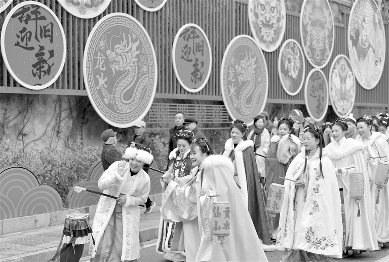 元宵节临近,各地迎元宵活动精彩纷呈,热热闹闹迎接佳节到来。2月23日,人们身着传统服饰在湖北省宣恩县城兴隆老街参加民俗展演巡游活动。新华社发(宋 文摄)