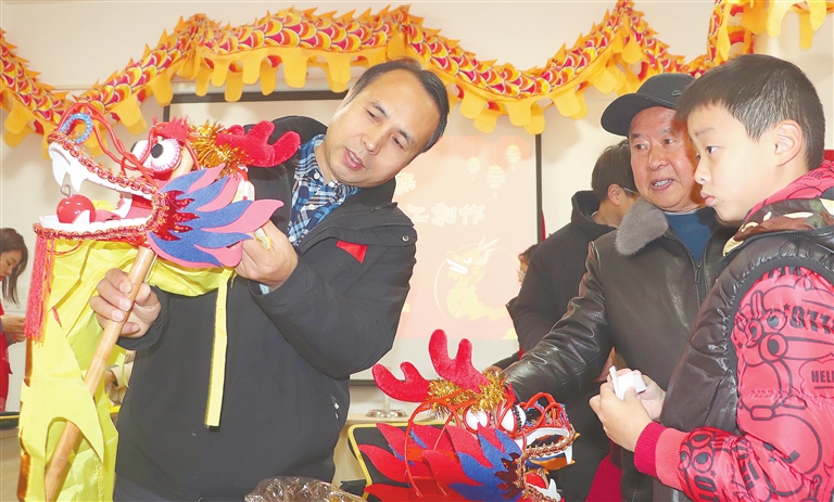 ▲2月23日,南昌市青云谱区城南龙灯非物质文化遗产传承人史克滨与广州路社区的孩子们一起制作彩带龙,迎接元宵节。本报全媒体首席记者 海 波摄