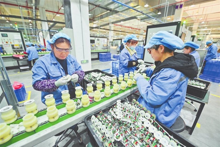 近日,瑞昌市江西凯耀照明有限公司工人正在生产线上赶制外销订单,冲刺首季开门红。本报全媒体记者 李 劼摄