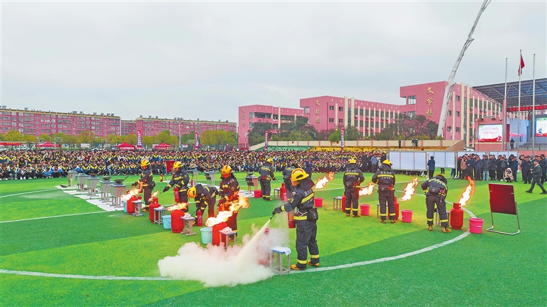 2月23日,吉水县在吉水中学开展“开学第一课”消防安全知识进校园活动,学校师生在消防员的指导下学习消防设备的正确使用方法和火场疏散逃生技能,进一步增强师生的消防安全意识,筑牢校园安全防线。 特约通讯员 廖 敏摄