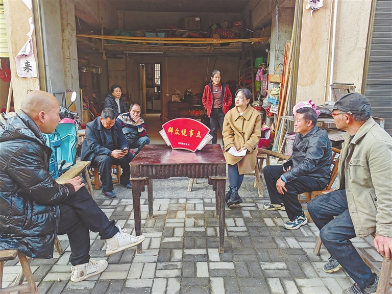 2月23日,是双溪镇马尾村的“群众说事日”。傍晚,三五成群的村民与镇人大代表坐在板凳上,热烈讨论着村里的大小事务,逐一诉说自己的问题和意见。