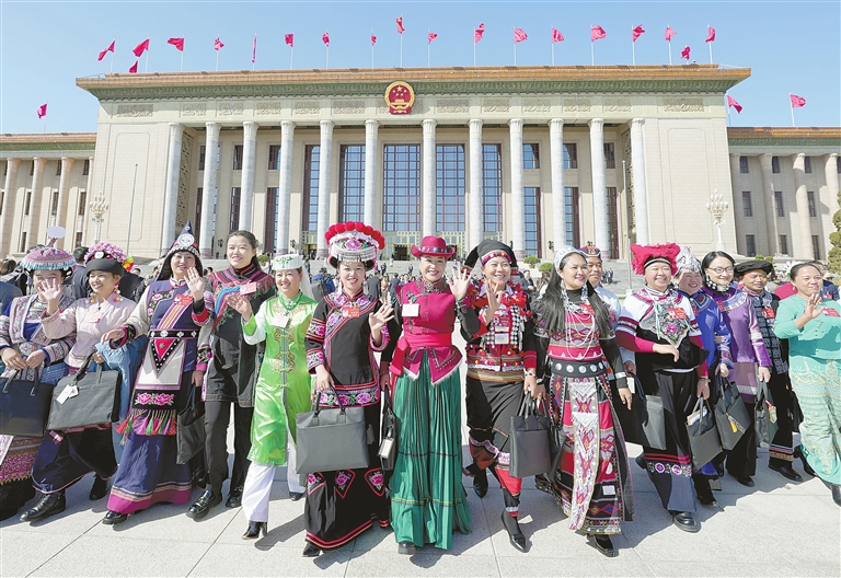 3月8日,十四届全国人大二次会议第二次全体会议结束后,女代表在北京人民大会堂前合影留念。 新华社记者 王毓国摄