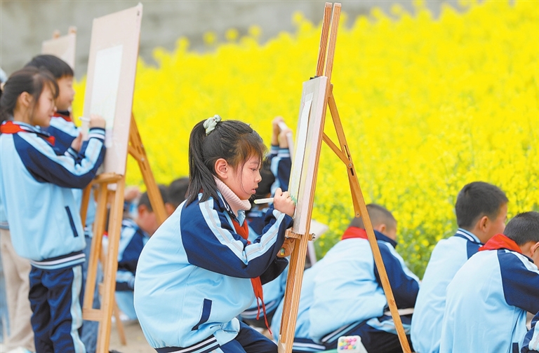 3月4日,泰和县塘洲镇中心小学学生在油菜花田里写生。该校组织兴趣课活动,让孩子们通过户外写生亲近自然。