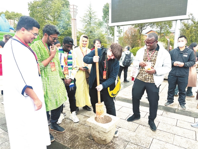 近日,赣南师范大学25名外籍师生受邀参加宁都县非遗文化旅游周系列活动,沉浸式体验赣南非遗客家民俗文化。图为师生现场打宁都肉丸。吴 翠摄