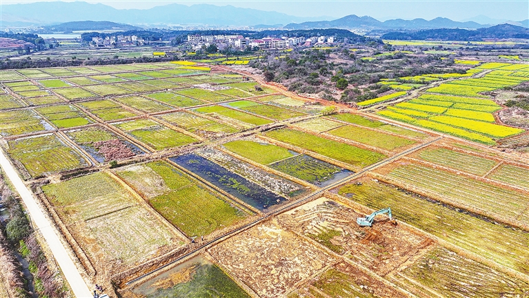 ▲ 3月8日,高安市独城镇南湖村李家村小组,大型机械正在进行翻挖整理作业,高标准农田建设现场一派繁忙景象。通讯员 胡可欣摄