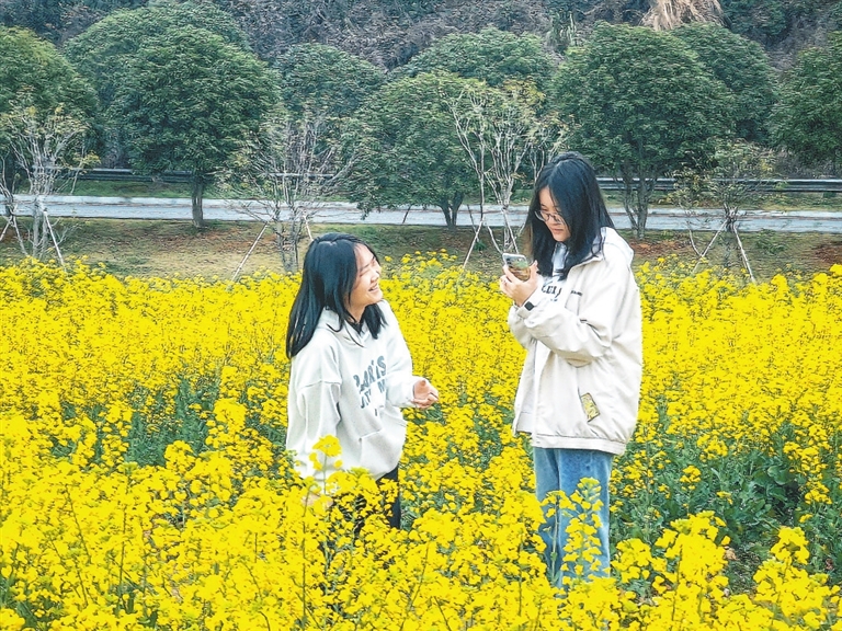 3月10日,游客在南昌梅岭生态旅游度假区的油菜花地赏花、打卡留念。本报全媒体记者 蔡铖歌摄