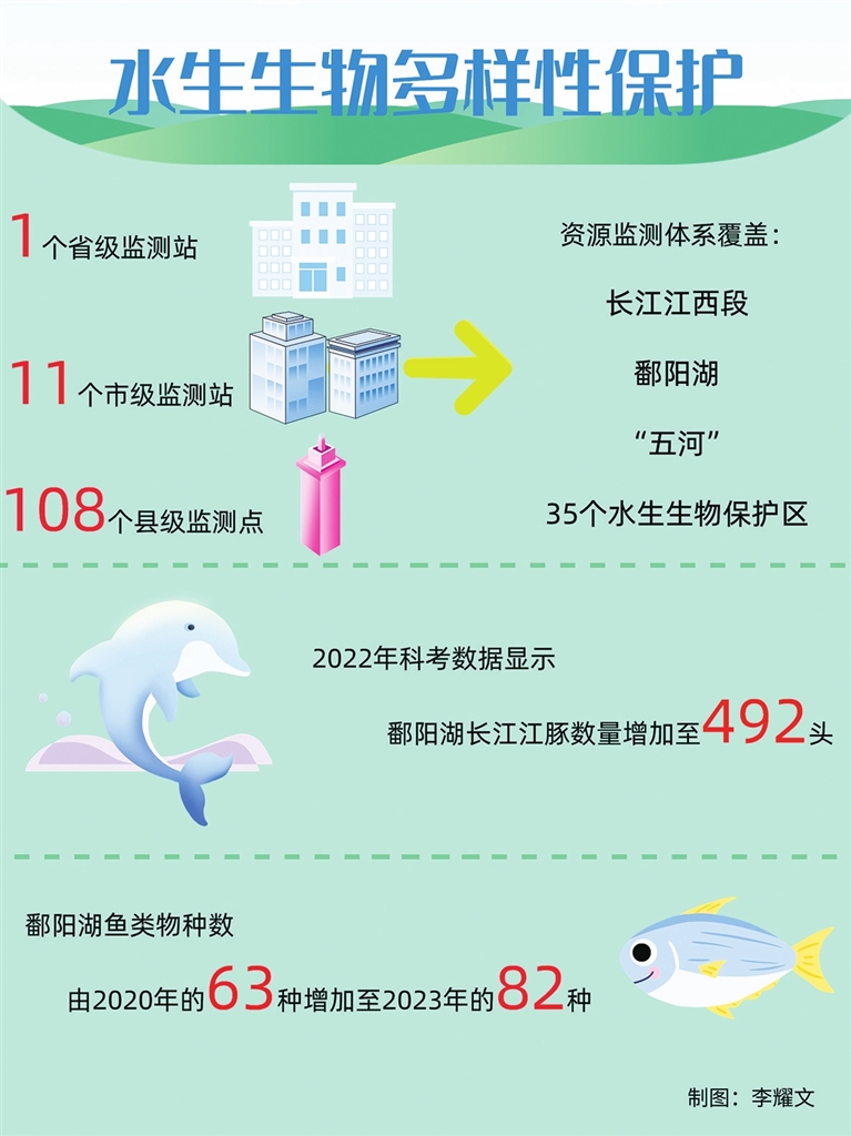 2020年,我省就着手推进水生生物资源监测工作,成立了江西省水生生物资源调查监测体系领导小组。如今,已形成了1个省级监测站、11个市级监测站、108个县级监测点的三级组织架构,覆盖长江江西段、鄱阳湖、“五河”及全省35个水生生物保护区等重点水域,并定期编制《江西省重点水域水生生物资源及生境状况公报》《鄱阳湖水生生物资源禁渔效果评估报告》《鄱阳湖水生生物完整性指导评价报告》,全面摸清水生生物资源变动情况。