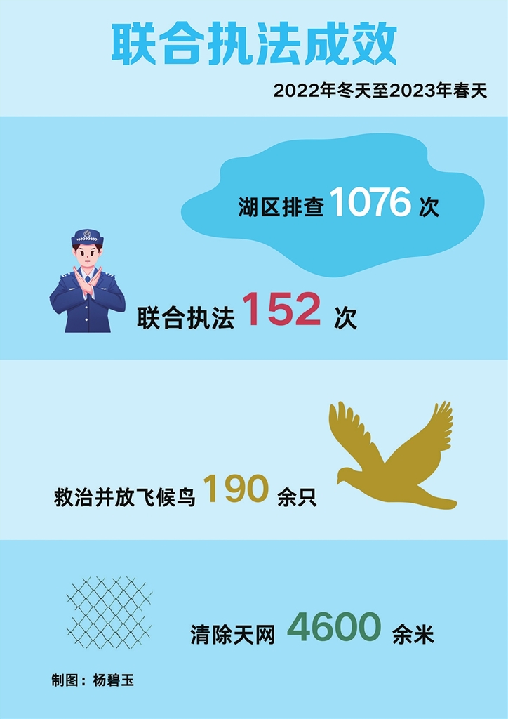 “联保委常态化开展联合执法,通过‘鄱湖利剑’等专项行动,深入排查,严厉打击非法猎捕、贩卖、食用候鸟行为。”江西鄱阳湖国家级自然保护区管理局(以下简称鄱保局)相关负责人表示,2022年冬天至2023年春天,沿湖各地开展排查1076次,联合执法152次,救治并放飞候鸟190余只,清除天网4600余米,办理刑事案件42起、行政案件43起,行政处罚51人。