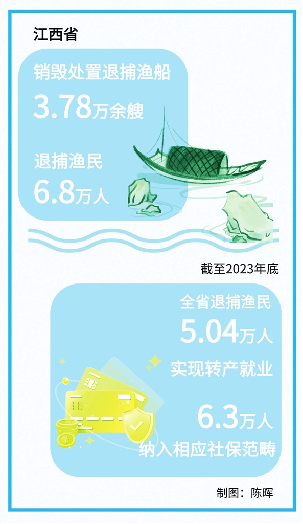 鄱阳县白沙洲乡退捕渔民范冬才,上岸后将家里改造成渔家农庄,生意蒸蒸日上;永修县退捕渔民甘华荣、吴春华夫妇,申请了公益性工作岗位,每个月都有固定收入;都昌县周溪镇梅沙村退捕渔民曹文平,从事内湖水产养殖,带动15名退捕渔民就业……