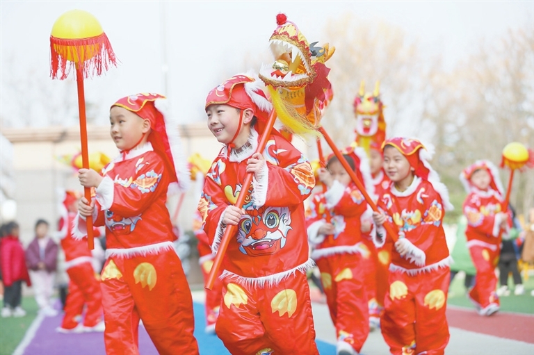 3月11日,山东省青岛市即墨区龙山中心幼儿园的孩子们在进行舞龙表演。当日是农历二月初二,各地举办丰富多彩的民俗活动,喜迎“二月二”。新华社发(梁孝鹏摄)
