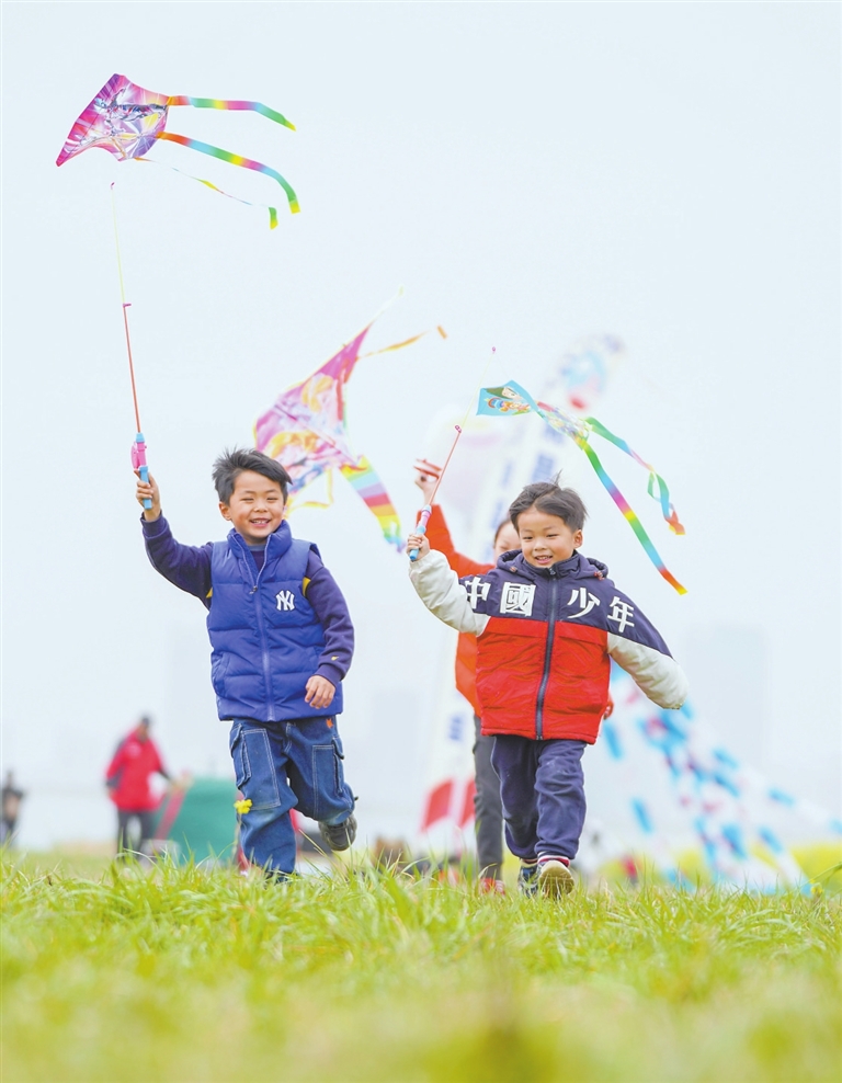 3月9日,在南昌市东湖区扬子洲镇裘家洲滩头,市民带着孩子前来赏花、露营、放风筝,乐享春光。