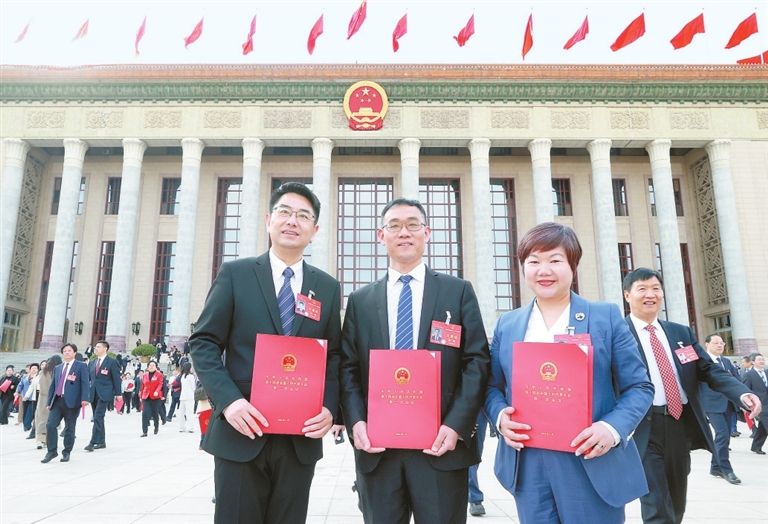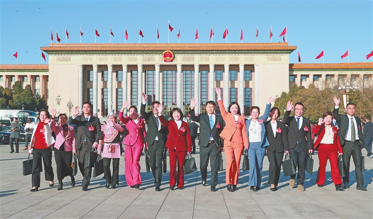 | 代表们在北京人民大会堂前留影,铭记庄严时刻。本报全媒体首席记者 海 波 摄 |