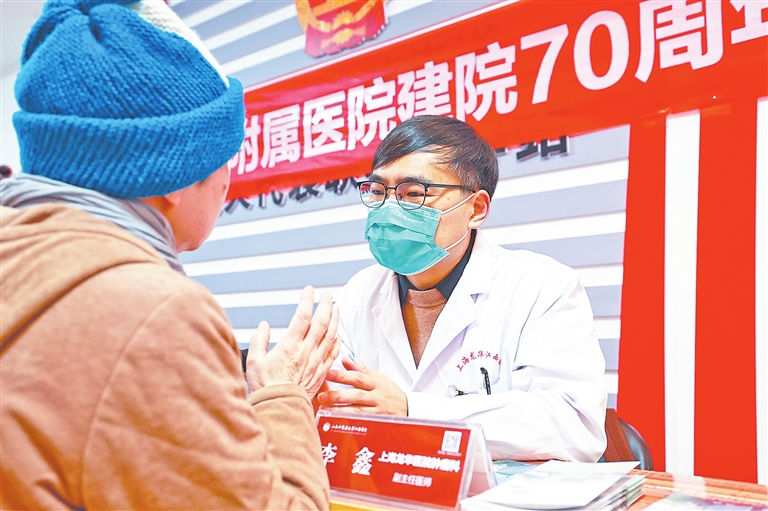 ▲ 为迎接建院70周年,日前,江西中医药大学附属医院联合南昌市东湖区大院街道福州路社区、院二社区,开展“弘扬雷锋精神 健康服务进社区”大型义诊活动。图为上海中医药大学附属龙华医院江西医院专家给群众问诊。王昕磊摄