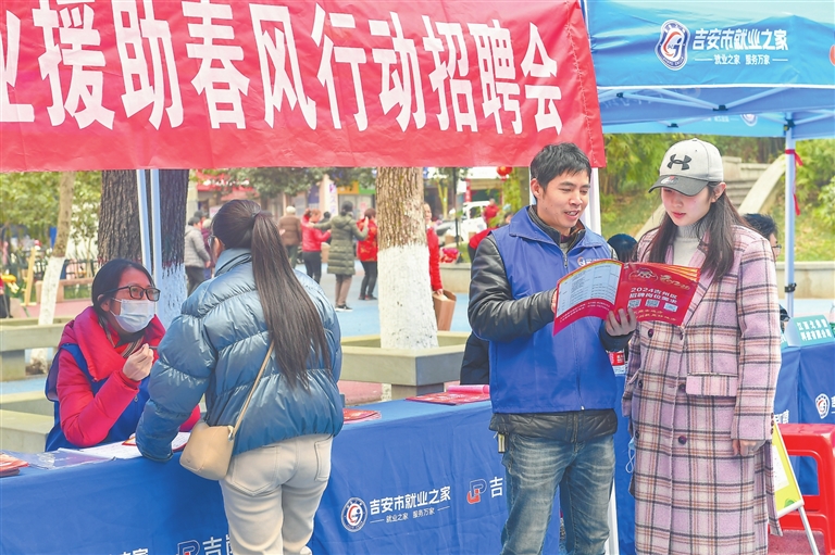 ◀日前,吉安市吉州区在仁山坪花鸟市场举办2024年文山街道就业之家就业援助春风行动招聘会,共提供近2000个岗位,助群众实现家门口就业。 通讯员 张建明摄