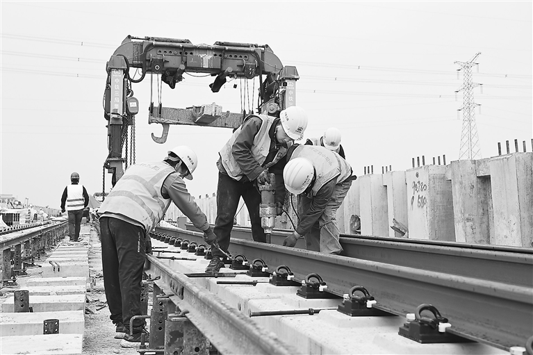 3月13日,在南昌地铁1号线北延线施工现场,工人们正在进行铺轨施工作业。据悉,1号线北延线始于昌北机场站,止于双港站,全长约16.9公里。目前,工人正加班加点赶进度,确保工程如期完成。