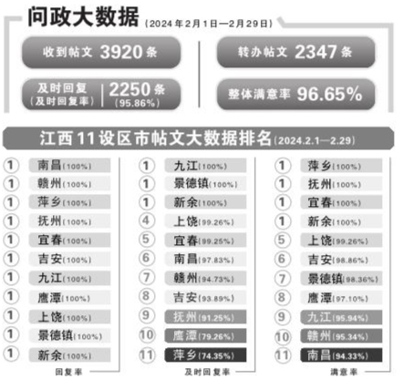 本报讯 (大江网全媒体记者李运辉 信息日报全媒体记者陈志燕)大江网《问政江西》栏目组2月问政大数据新鲜出炉,数据显示, 2月1日至2月29日,收到群众投诉建议帖文3920条,其中2347条帖文证据相对充足、内容详实,已转办到各职能部门。本期及时回复2250条,及时回复率95.86%,整体满意率96.65%,新余表现亮眼,及时回复率和满意率均排名靠前。