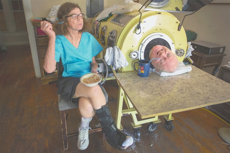 这是2018年4月27日在美国达拉斯拍摄的“铁肺人”保罗·亚历山大(右)在家中的照片。据美国媒体3月13日报道,78岁的保罗·亚历山大11日去世,他曾被吉尼斯世界纪录认证为世界上依靠“铁肺”存活时间最长的患者