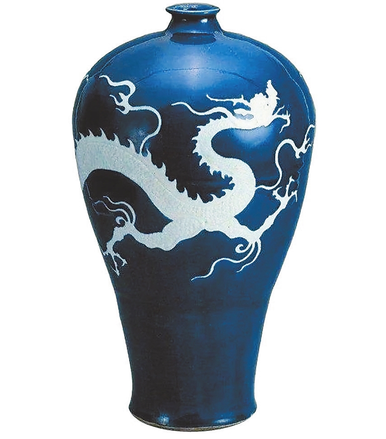珍藏于扬州博物馆的元代霁蓝釉白龙纹梅瓶(图1),也是一件国宝级文物,2013年被列入禁止出国(境)展览文物目录,现陈设在200平方米的国宝馆展厅,观众远远便能一睹其“芳容”。该梅瓶以霁蓝釉为地,一条白龙“盘旋”,龙首高昂,脖子细长,腿刚劲有力,以蓝釉点睛,在火珠、流云纹的映衬下,显得威猛雄壮。