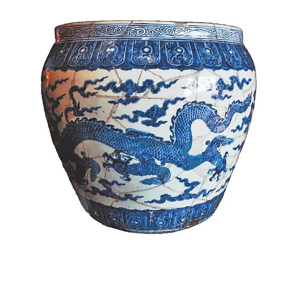 景德镇御窑博物馆展厅内,陈列着一个精心修复的明代青花大龙缸(图2),两条矫健的青花巨龙“飞翔”于云彩间,躯干健硕,龙鳞细密,五爪锋利,气势逼人。