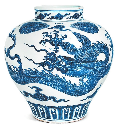 饰以龙纹的景德镇御瓷,由于精制典雅美观,受到历代收藏家的青睐,在拍卖场上的拍卖价格也是屡创新高。2016年香港佳士得30周年拍卖会上,一个明宣德青花五爪云龙纹大罐(图3),以1.4亿港元落槌,含佣金达1.58亿港元;2019年北京保利春拍的清雍正御制青花釉里红云海腾龙天球瓶,以1.472亿元人民币成交。