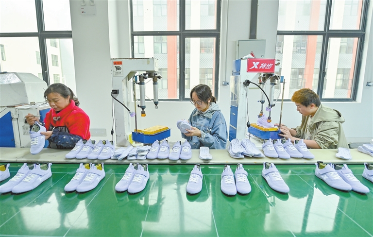 3月13日,在会昌县西江镇乡村振兴产业基地,新投产的赣州市聚荣科技发展有限公司工人正在生产运动鞋。目前,该基地已入驻服装、鞋帽、电子等劳动密集型企业14家,解决农村劳动力就业约2000人。