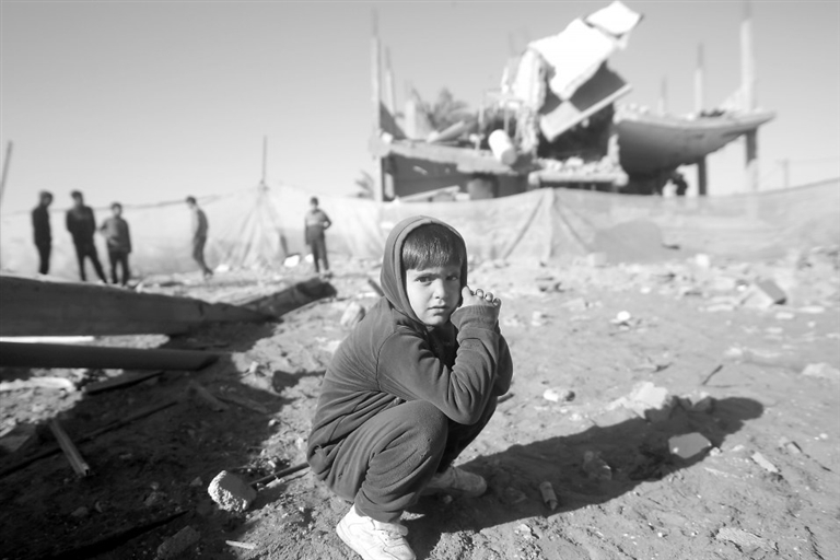 3月15日,在加沙地带南部城市拉法,一名男孩蹲在以军空袭后的损毁建筑附近。