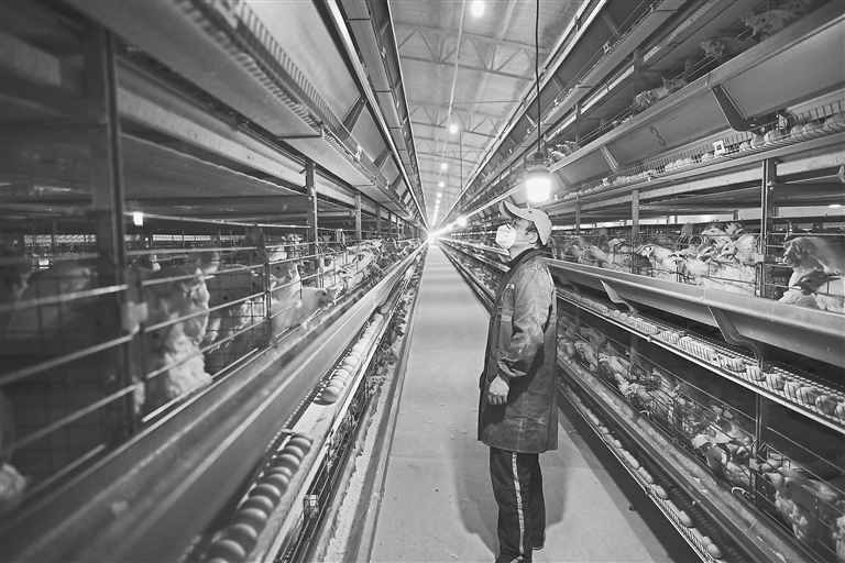 3月14日,在高安市祥符镇建山村蛋鸡养殖基地,工作人员正在鸡舍内检查。据悉,该基地采用机械化、自动化、规模化、精细化的养殖模式,日产蛋32万枚,年产值7000多万元。 本报全媒体记者 洪子波摄