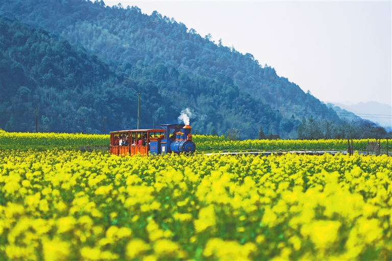 春意渐浓,婺源县赋春镇严田村的油菜花陆续开放,金黄色油菜花与青山相互映衬,构成一幅美丽的春日画卷。各地游客纷至沓来,乘上“开往春天的小火车”欣赏这幅难得的田园美景。